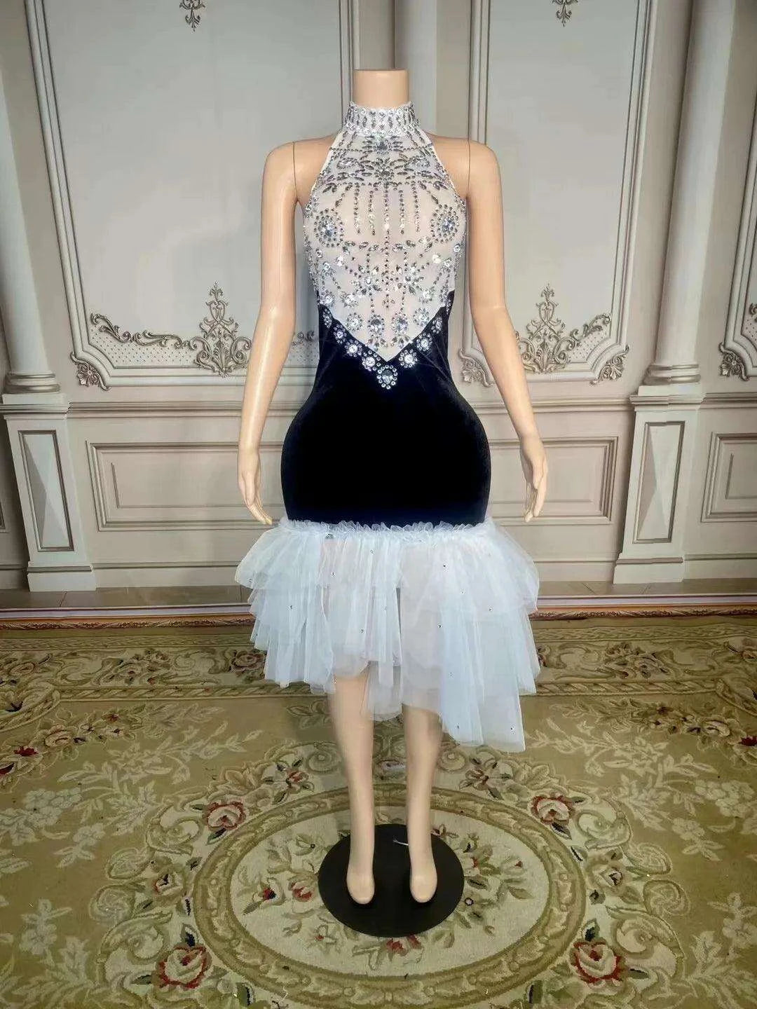 Glamorous Black Velour Halter Dress with Dazzling Crystal Accents