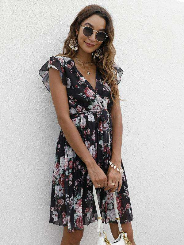 Chic V-Neck Floral Tie-Waist Dress for Effortless Elegance