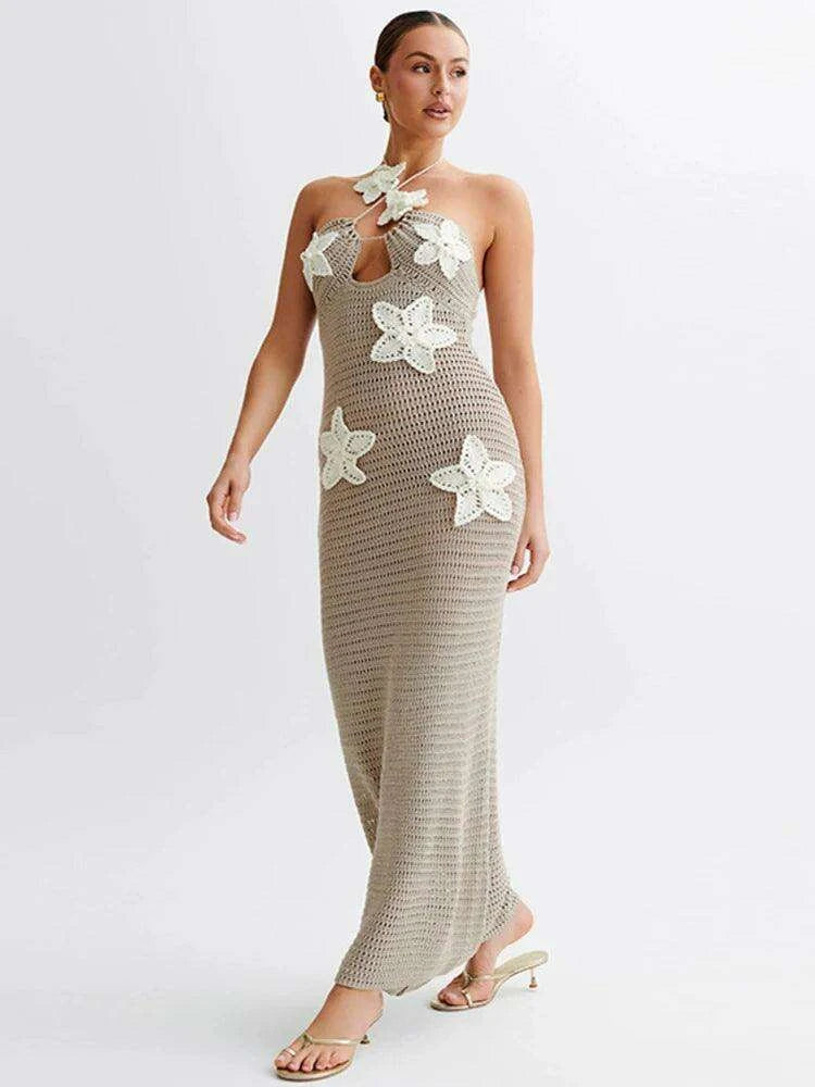 Elegant Halter Backless Floral Crochet Maxi Dress for Women - Perfect for Summer Parties and Beach Escapes