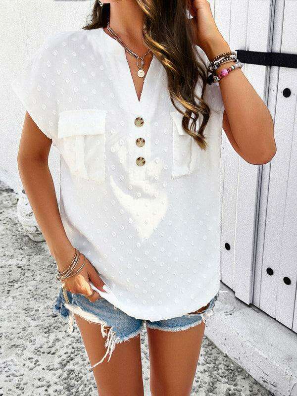 Transform your warm-weather wardrobe with the Elegant Jacquard V-neck Blouse. This sophisticated blouse seamlessly blends chic style with ultimate comfort, making it the perfect addition for those sunny days ahead.