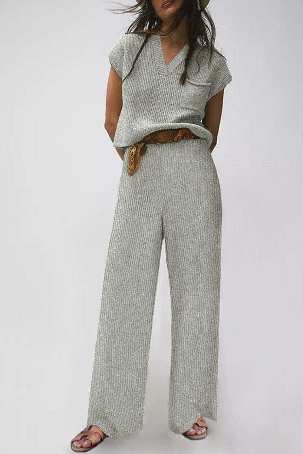 Chic Knit V Neck Sweater and Wide-Leg Trousers Set