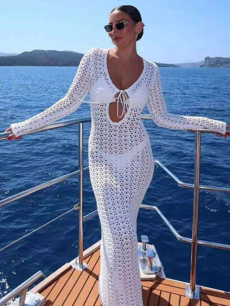 Elegant Lace-Up V Neck White Hollow Maxi Dress for Women - Trendy Long Sleeve Summer Beachwear
