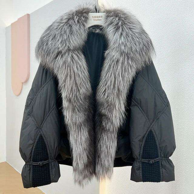 This jacket is more than just clothing; it's a symbol of sophistication and comfort. The Genuine Silver Fox Fur Collar exudes glamour, while the premium White Duck Down ensures unmatched warmth, blending practicality with elegance.