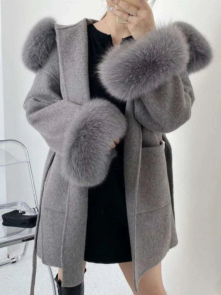 Luxurious Fox Fur Trimmed Wool Blend Winter Coat for Women with Cashmere Lining