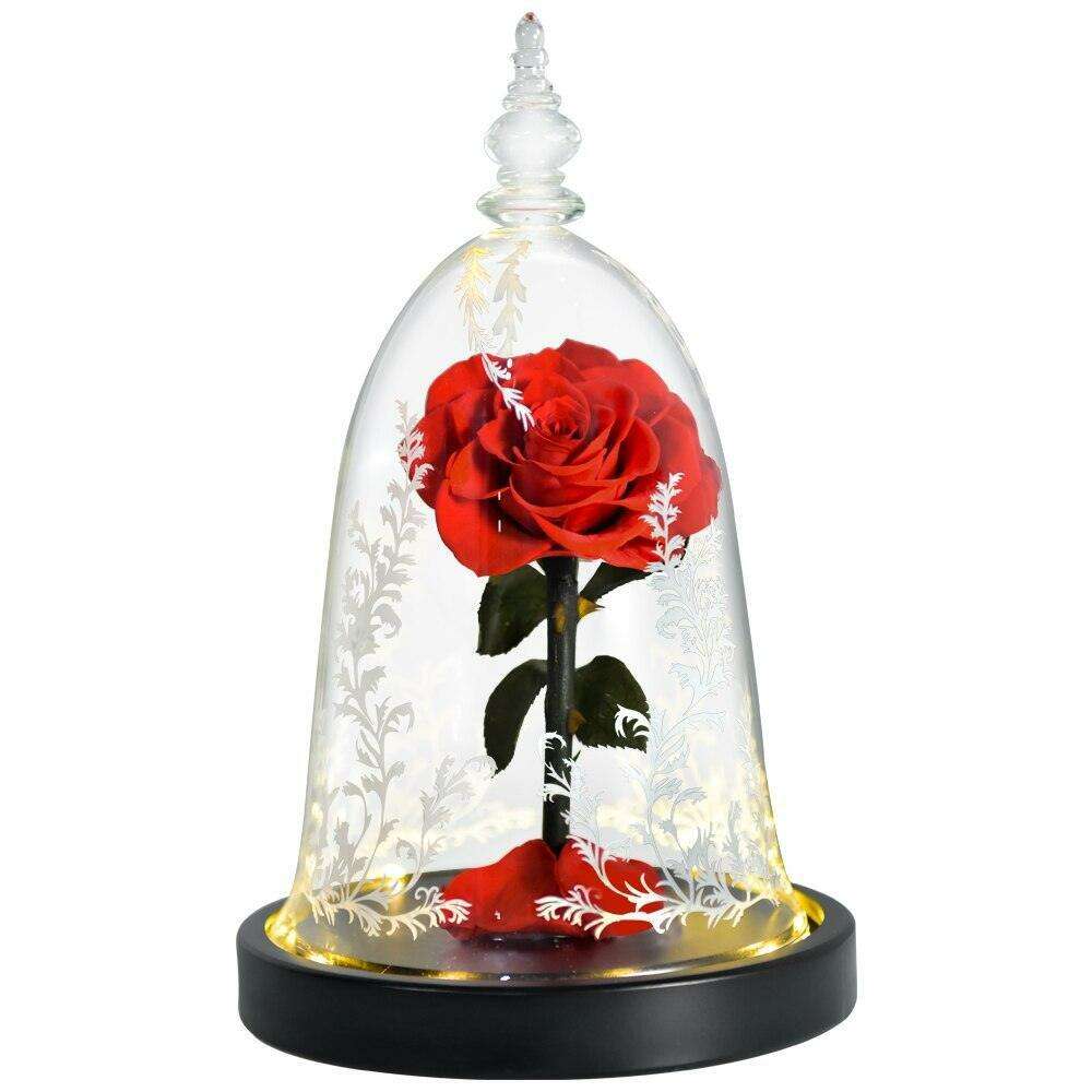 - Crafted from Galaxy Rose, gold foil, glass dome, and wooden base.