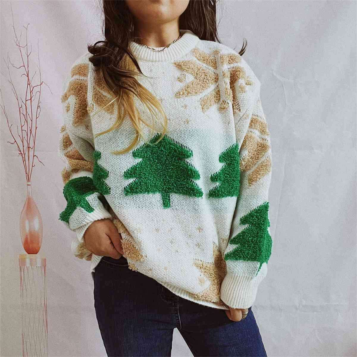 Festive Cozy Snowflake Long Sleeve Sweater with Round Neck