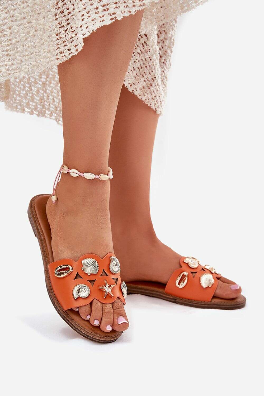 Women's sandals made of eco leather. Set on a flat heel. The model stands out with gold, marine pins that give them a unique character. Soft insole provides comfort throughout the day, and simple yet stylish design makes these sandals perfect for summer stylings. Ideal for everyday use, combining functionality with a trendy look.