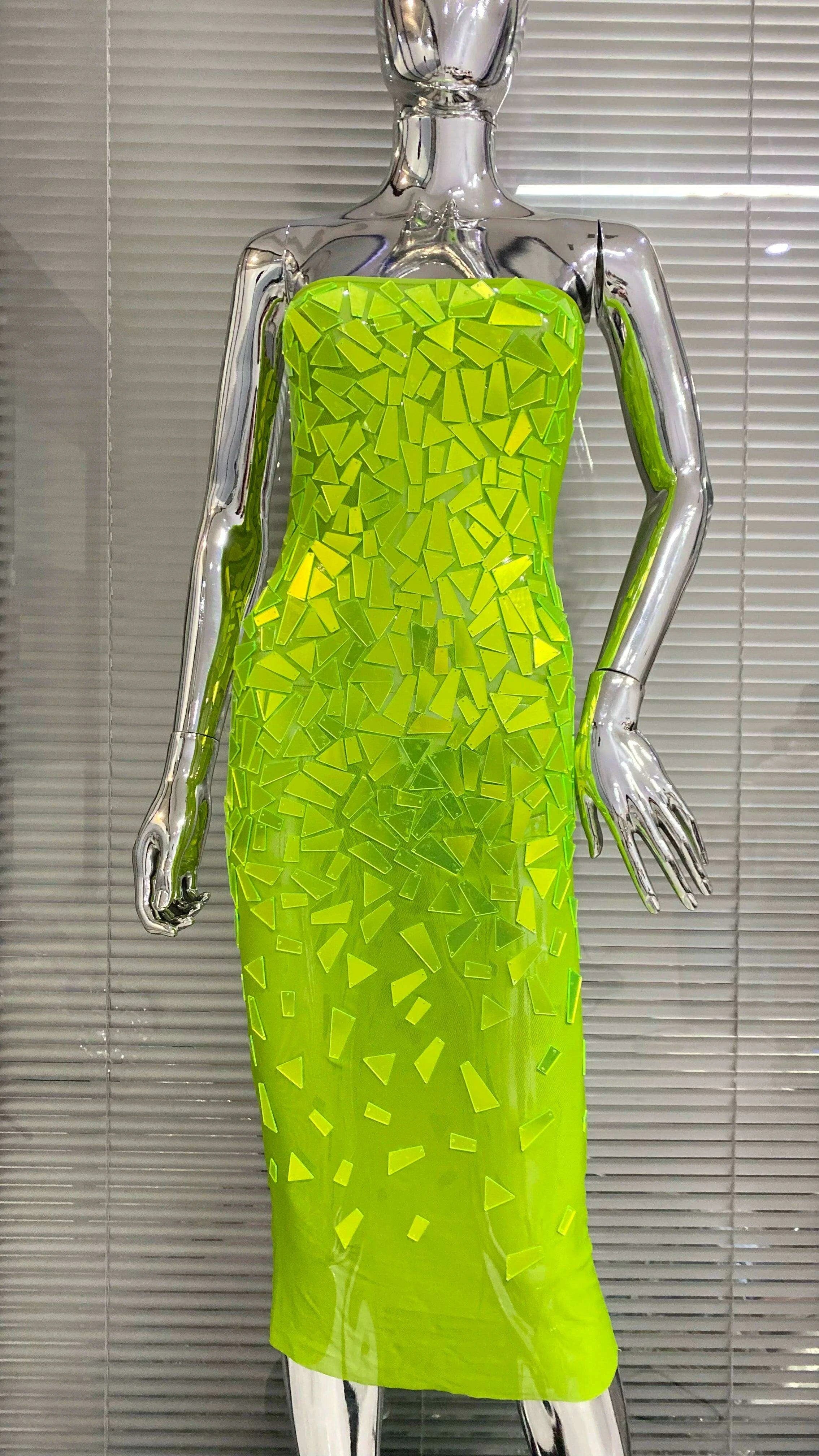 Fluorescent Green Sequin Triangle Midi Bodycon Gown