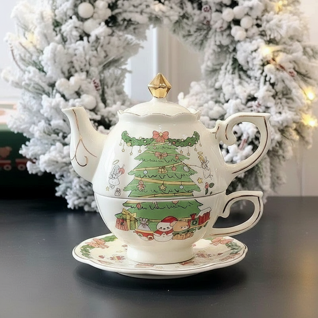 Vintage-Inspired Hand-Drawn Christmas Tea Set in Gift Box