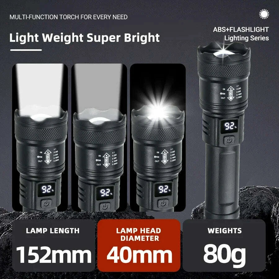 High Strong Power Led Flashlights 2000LM Tactical Torch with Display Light USB Charging Camping Fishing Emergency Zoom Lantern..