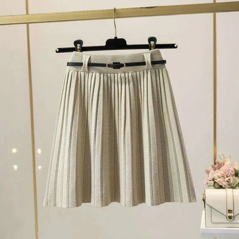 High Waist Pleated Mini Skirt - Korean-Inspired A-Line Knitted Solid Skirt with Belt