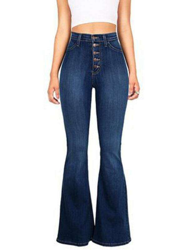 High-Waisted Denim Flare Trousers with Decorative Buttons