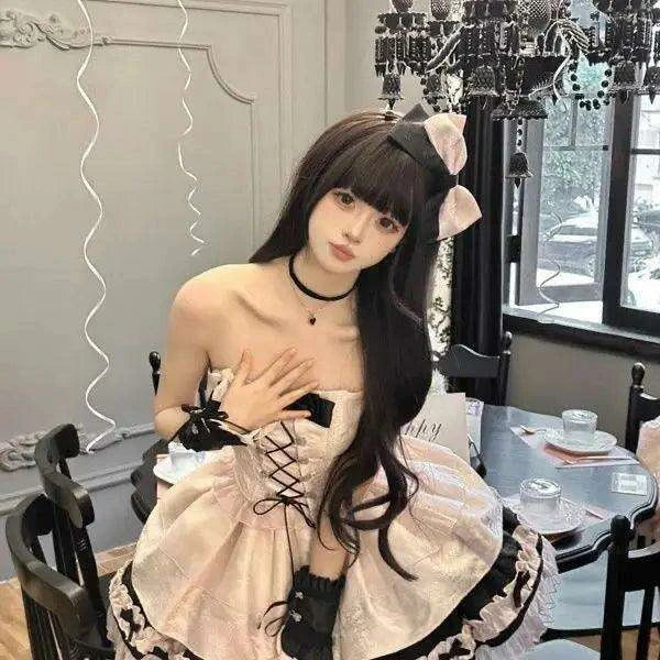 Experience the captivating contrast of black and pink that creates a striking visual appeal. The whimsical bow detail adds a playful touch, embodying the kawaii aesthetic at its finest. This dress radiates youthful charm while providing sophisticated flair, making it a must-have for any trendsetting girl.