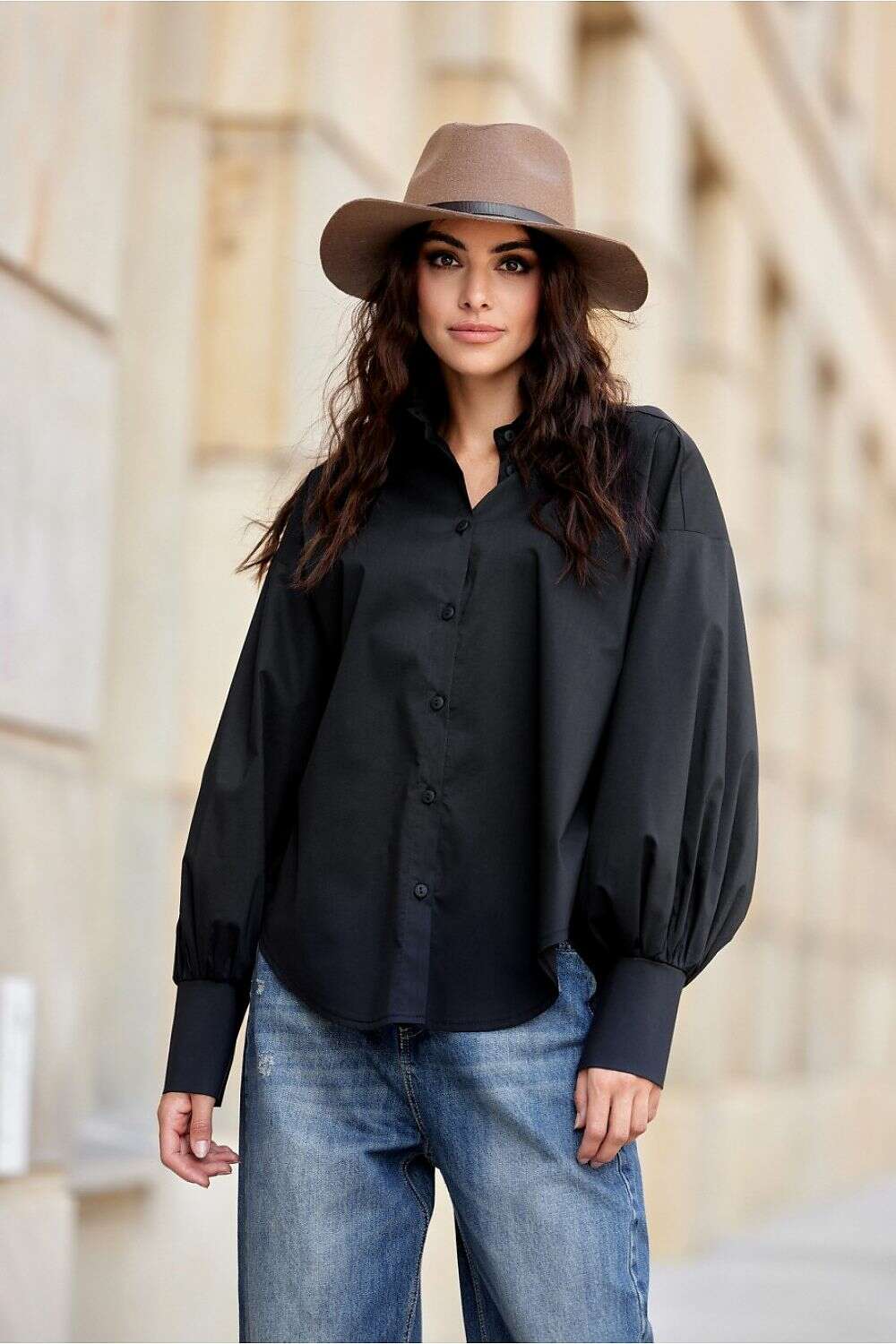 Made of breathable, high-quality material, it provides unparalleled comfort for both cool and hot days. Its subtle color, combined with buttons that blend perfectly into the fabric, creates a minimalist but incredibly stylish effect. The shirt has a standard length and a slightly flared cut shortened on the sides, which gives the silhouette a beautiful shape. The charming collar and puffy sleeve, finished with three elegant buttons, perfectly emphasize the feminine silhouette, adding unique character at the same time. Our shirt will work perfectly in many combinations. You can combine it with classic pleated pants, creating an elegant look for the office. When paired with jeans or a leather skirt, you'll get a casual yet very stylish outfit for a meeting with friends. Add your favorite heels or elegant flats, and for an evening out, just add your favorite jewelry and bag. This shirt is a must-have in every wardrobe! It will work perfectly for formal events such as business meetings or weddings, as well as for more relaxed outings, such as brunch with friends or a romantic dinner. The product is manufactured and sewn in Poland.