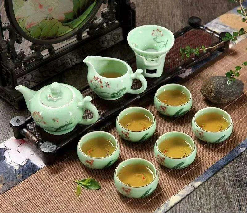 Lotus Landscape Longquan Celadon Kung Fu Tea Set - Exquisite 9-Piece Gift Collection for Tea Enthusiasts