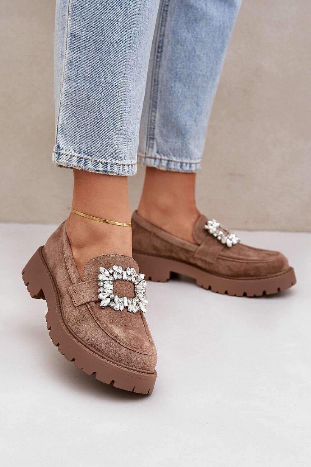 Women's loafers made of ecological suede. The ornament in the form of a brooch adds elegance. Set on a flat heel, making them extremely comfortable. This is the perfect model for spring days, which will perfectly complement various stylizations. Be sure to add these trendy loafers to your collection to emphasize your unique style!