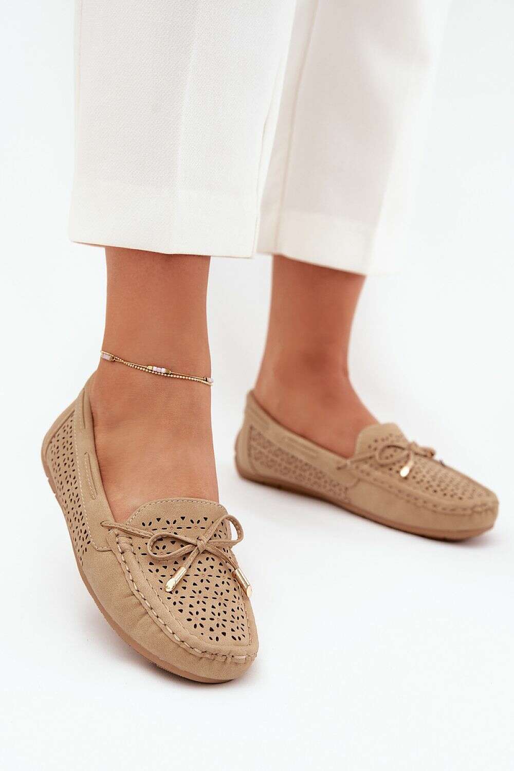 Women's loafers made of eco-leather, decorated with a lace pattern, are a perfect proposal for spring and summer. At the front there is a bow tie that adds subtlety and charm. The soft insole provides comfort throughout the day, and the rounded toes guarantee comfort. Perfect for casual stylizations, they go well with dresses, skirts and trousers, adding lightness and elegance to every outfit.