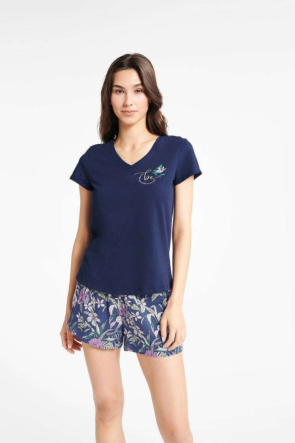 • Stylish Design: This set features a chic navy blue short-sleeved T-shirt paired with coordinating shorts, making it the ideal choice for lounging in style.