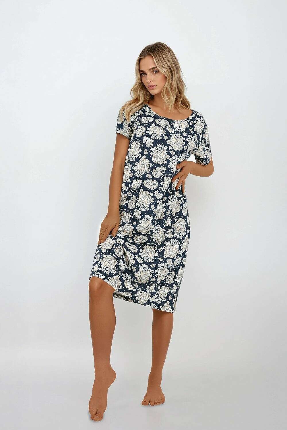 Women's nightshirt in a classic cut Classic is the perfect combination of feminine style, comfort, and quality. Made of natural, hypoallergenic materials, it is an excellent choice even for the most demanding skin. The soft, breathable fabric envelops the body, providing full comfort during sleep. The shirt has a round neckline that gently emphasizes the neck and shoulders, giving the whole a subtle, feminine character. The loose yet shapely cut guarantees freedom of movement while maintaining a stylish appearance. The high quality of the material print and careful finishing indicate attention to every detail. The product was designed and sewn in Poland, emphasizing its uniqueness and high quality. It is an ideal proposition for women who appreciate elegance, naturalness, and comfort both in everyday life and during calm, relaxing evenings.