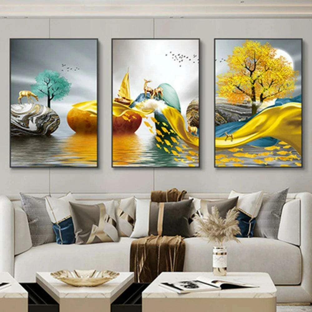 Nordic Elegance: Golden Deer Abstract Landscape 3-Piece Canvas Art Set with Customizable Borders for Luxury Home Decor - Très Elite