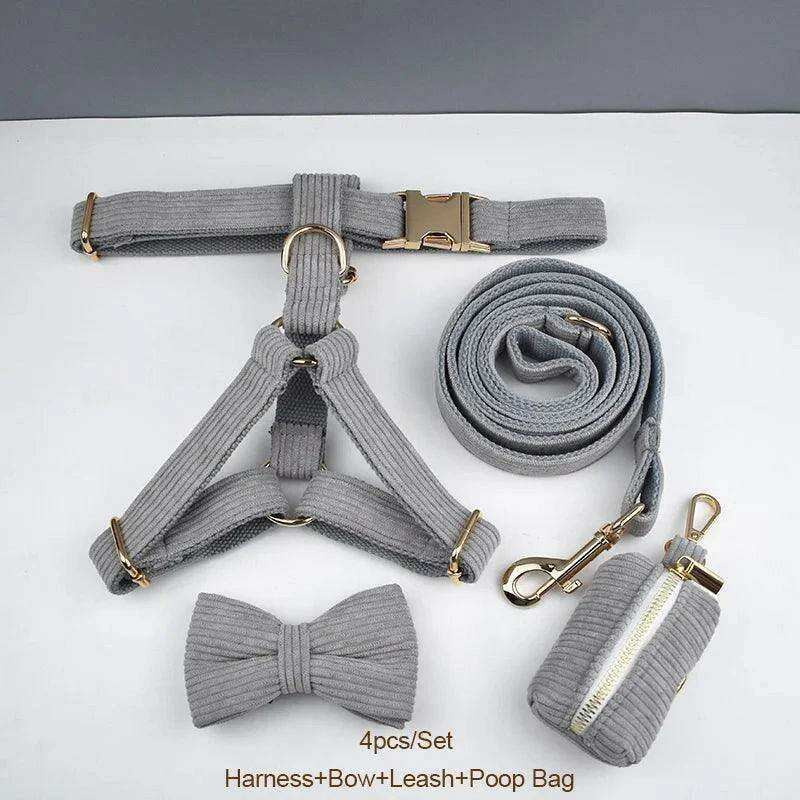 Personalized Light Grey Corduroy Dog Collar and Leash Set with Stylish Accessories