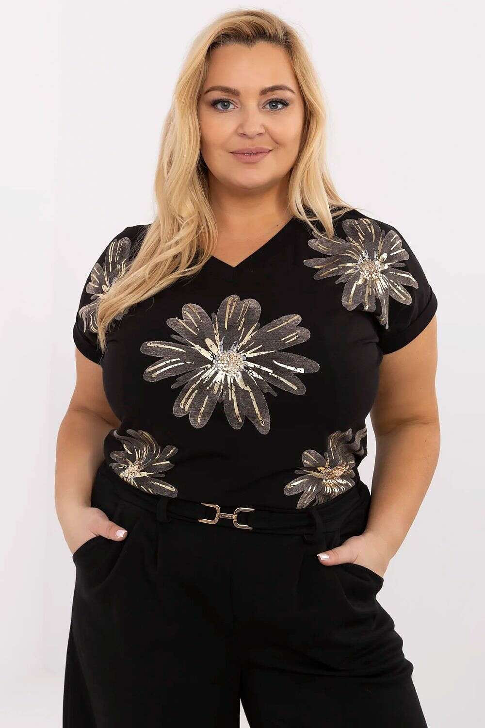 Daily women's plus size casual blouse is a combination of comfort and feminine charm. Made of soft, breathable cotton with added elastane, it perfectly fits the silhouette, providing freedom of movement and comfort throughout the day. Standard length model, with short sleeves and a sweetheart neckline that subtly accentuates the neckline. The main decorative element is a printed floral motif enriched with shiny rhinestones, adding a delicate, stylish accent to the blouse. Ideal for everyday wear with jeans, skirts, or trousers. A great suggestion for women looking for a comfortable and eye-catching blouse for any occasion.