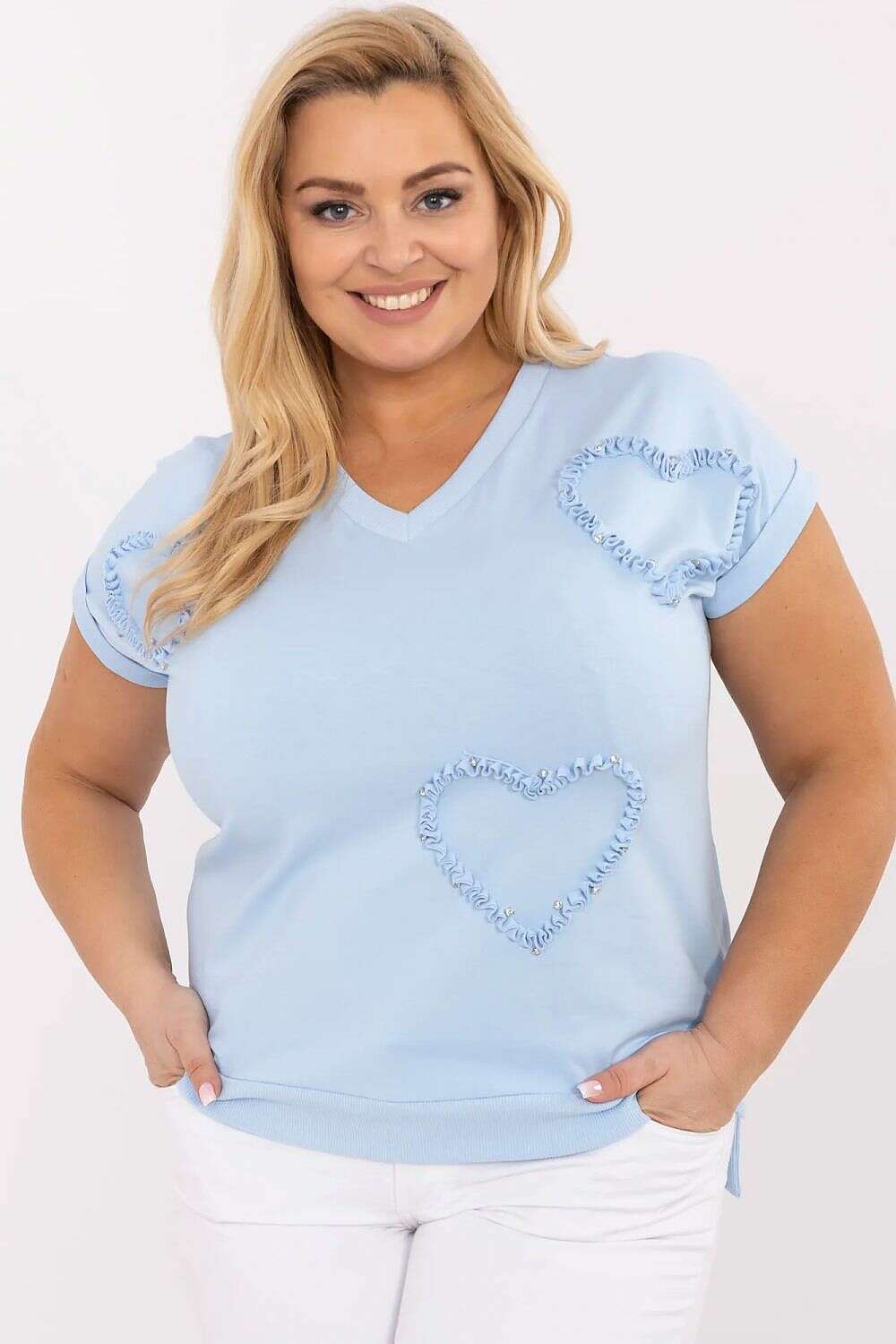 Women's plus size casual blouse is an ideal proposition for everyday wear as well as for work. Made of pleasant to the touch cotton with the addition of elastane, it provides comfort and perfect fit to the silhouette. The model is of standard length, with short sleeves and a feminine sweetheart neckline that subtly emphasizes the neck. The attention is drawn by a spectacular application on the front in the shape of hearts adorned with sparkling zircons, adding an elegant and delicate charm to the blouse. Great for everyday stylizations, it will work well with both jeans and more classic trousers or a skirt. Universal, comfortable, and with character, perfect for work and for more casual meetings.
