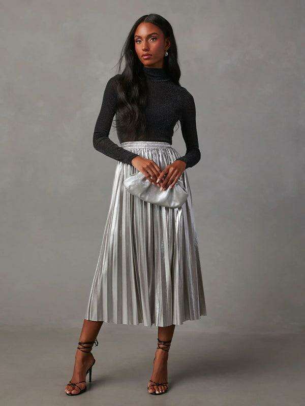 Glistening Grace: Chic High-Waist Pleated Midi Skirt