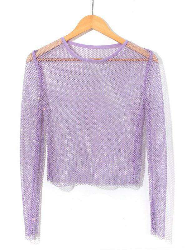 Rhinestone-Embellished Sheer Mesh Crop Top for Fashion-Forward Women