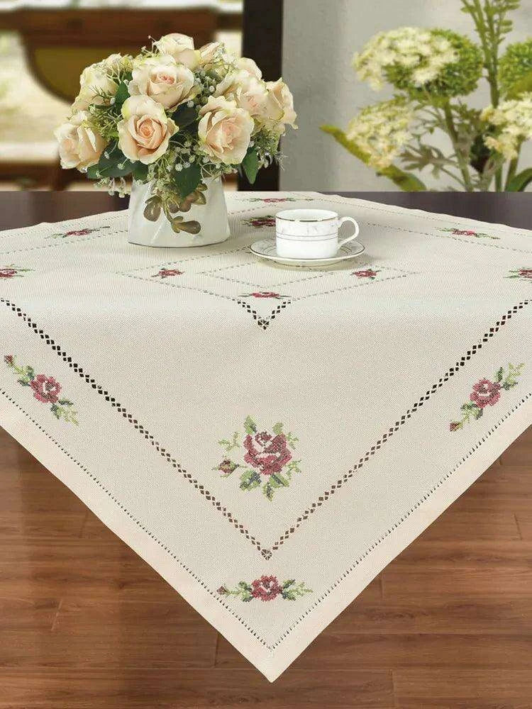 Romantic Rose Cross-Stitch Linen Table Runner & Cloth Set - White/Champagne