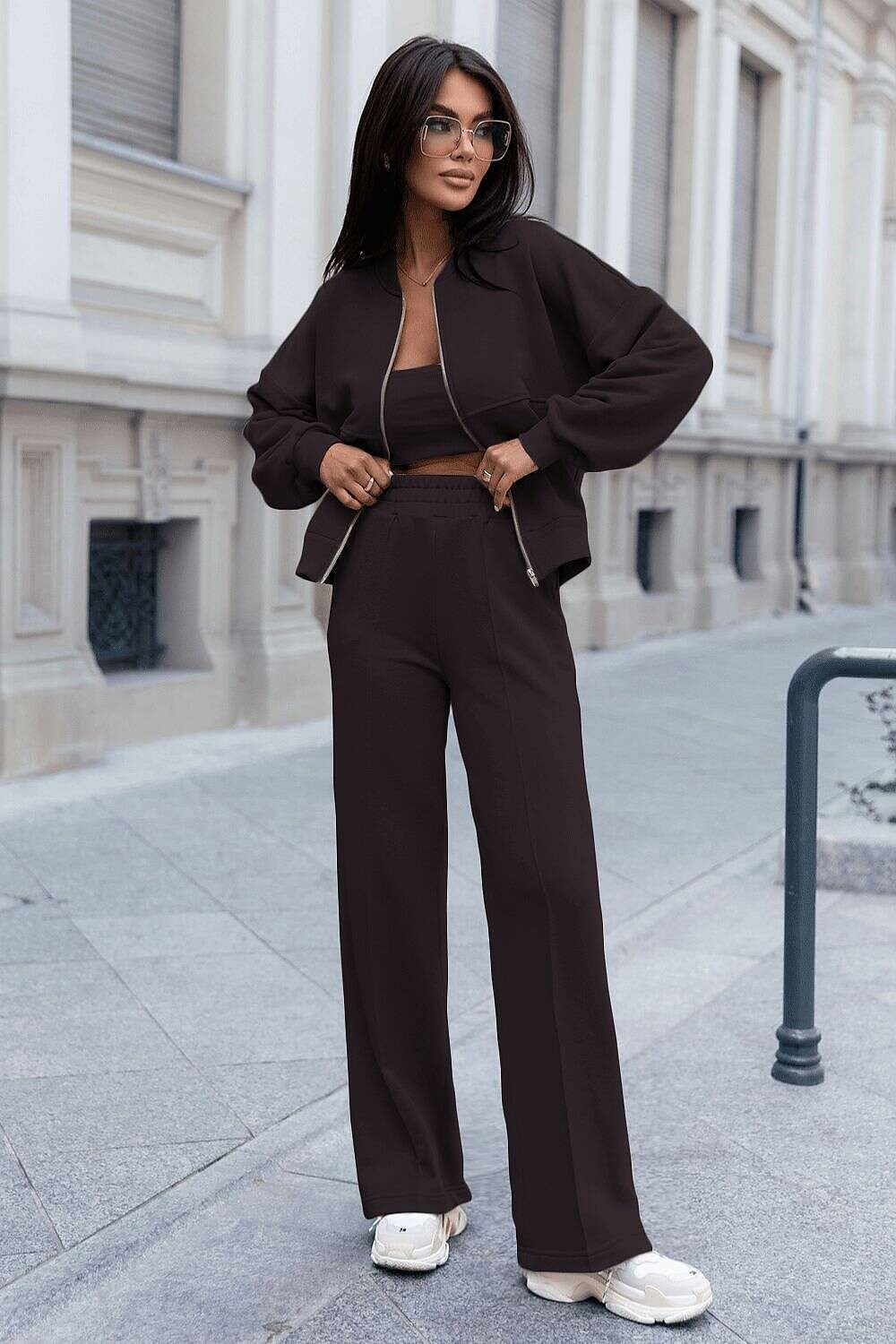 Misty two-piece sweatshirt set featuring a fashionable bomber sweatshirt paired with wide-leg pants. This season's styling essential you can reach for all year round, offering effortless comfort and a contemporary silhouette.
