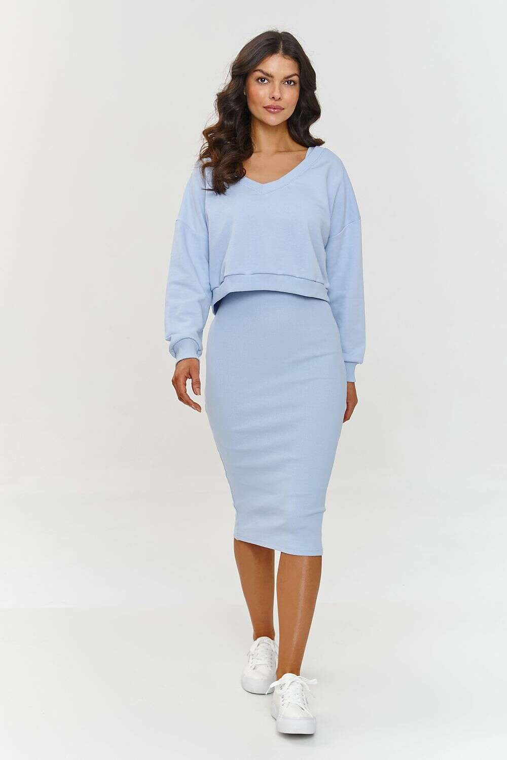 This tracksuit is a proposal for women who appreciate style with a hint of comfort. The simple cut and versatile form of the dress perfectly accentuates the silhouette. Thanks to the ribbed structure of the material, it is both elastic and compact, providing full freedom of movement. The midi length is a fashion classic that further emphasizes elegance and never goes out of style. The loose cut of the blouse and the V-neckline give it a casual yet stylish character. Sleeves with ribbed cuffs allow for length adjustment, and the short waistband fits perfectly with the dress, adding lightness to it. The loose blouse and fitted dress create a fashionable yet practical look that is suitable for both everyday meetings and more relaxing days at home.