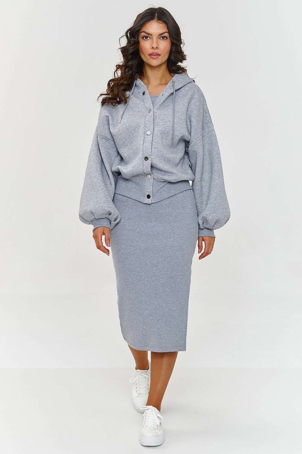 One set, many possibilities! A sleeveless striped dress and a zip-up hoodie are a set created for women who value comfort and versatility. With these two elements, you can adjust your outfit to any season - wear the dress alone in the summer, and complement the look with a warm hoodie on cooler days. The striped dress fits the silhouette, accentuates the shape, but does not restrict movement, and the additional side slit adds femininity and sensuality. The hoodie with a hood has a comfortable closure, making it suitable for many outfits. Additionally, it is made of thicker sweatshirt material, making it so versatile that you can use it as a complement to any outfit for any season. The hoodie is designed in a loose, oversized cut, providing full freedom of movement. The ribbed cuffs and bottom add a trendy touch to the overall design. Wear the dress alone on warmer days and enjoy a light, feminine look. When it gets cooler, simply throw on the hoodie with snaps to create a casual, practical outfit, perfect for work, a walk, or quick shopping. You can wear these items together or separately, combining them with other clothing such as sneakers, ankle boots, or trainers. This set goes with everything! Choose a stylish and functional set that will adapt to your lifestyle!