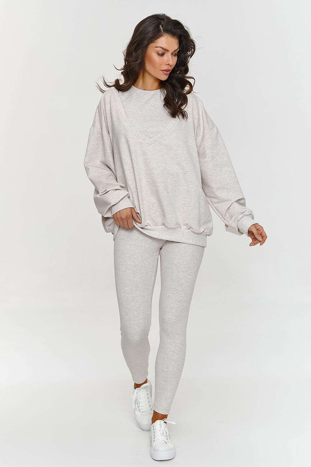The tracksuit set is the perfect choice for women looking for comfort and style for everyday wear. The set consists of an oversized sweatshirt, a ribbed top, and leggings, which together create a cohesive, fashionable whole. Fitted, ribbed leggings perfectly emphasize the silhouette, providing both comfort and style. The fitted top and loose sweatshirt with a deep v-neck perfectly balance the whole and add a feminine charm. The material is soft and pleasant to the touch, perfect for everyday wear. The combination of a classic sweatshirt with a top and ribbed leggings gives the outfit a slightly sporty character. Thanks to its versatility, this set pairs perfectly with white sneakers, creating a comfortable everyday outfit. Have you been looking for a set that combines elegance with comfort? The tracksuit set with a top and leggings is a must-have in your wardrobe! It is the perfect combination of comfort, functionality, and trendy design. Suitable for various occasions, from relaxing at home to meeting friends or walking in the park. Choose our set, which will add confidence and make you feel comfortable in any situation!