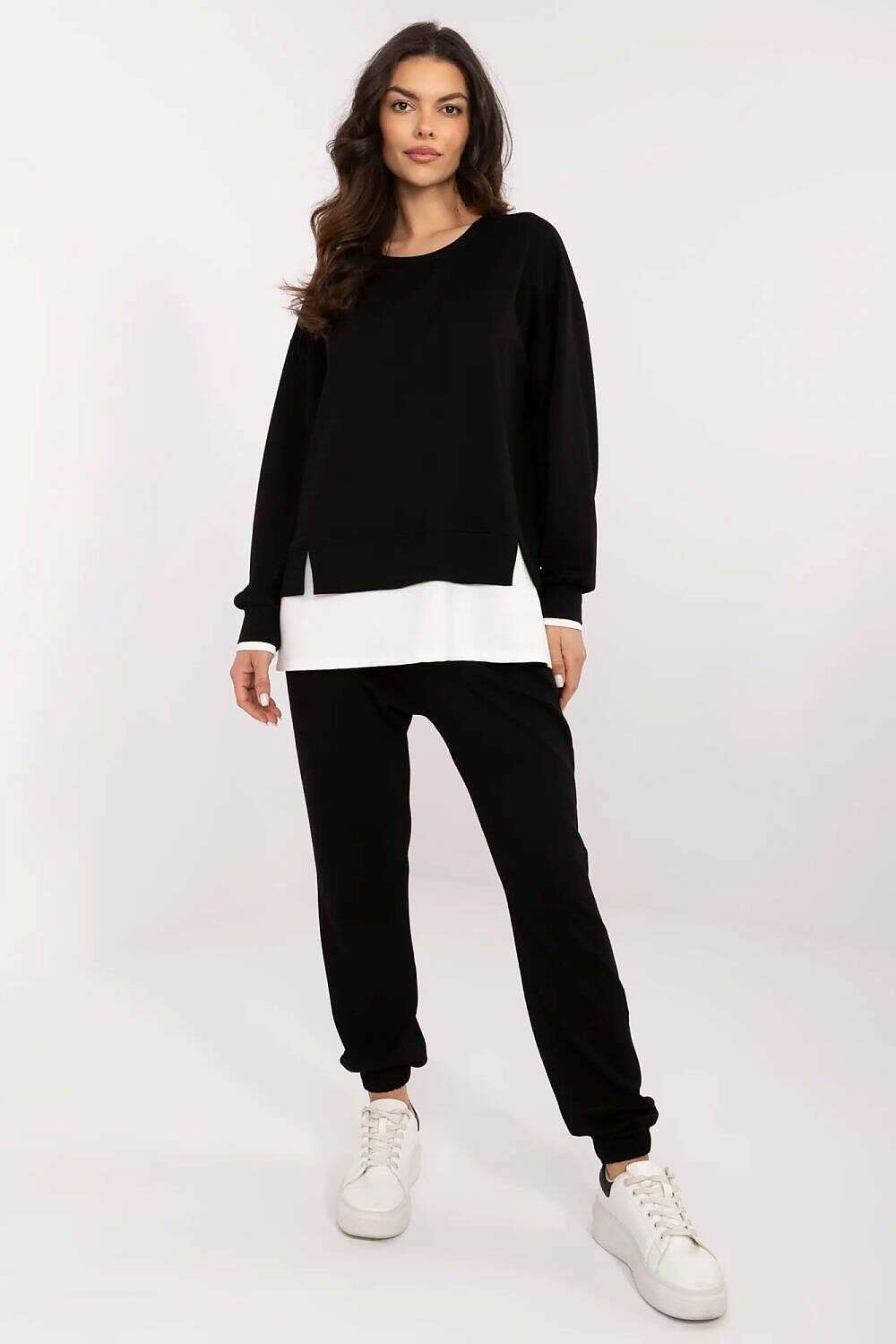 Women's tracksuit set in a casual style, perfect for everyday wear. Made of soft and elastic blend of viscose, polyester and elastane, ensures comfort and freedom of movement. Smooth fabric emphasizes the modern design of the set. The sweatshirt with long sleeves stands out with a contrasting insert at the bottom, adding to its original character. High-waisted pants with slip pockets and cuffs at the bottom guarantee comfort and fit. An ideal choice for relaxing at home, walking or everyday outings. Butter-like material, exceptionally soft, pleasant to the touch, perfectly fitting to the body.