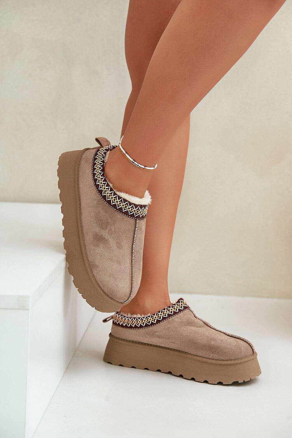 Stylish slippers made of eco suede are a perfect choice for colder days. Set on a platform, with covered toes and lined with soft fur, they provide comfort and warmth. The top of the shaft is adorned with subtle embroidery, which gives them an elegant character. Perfect for everyday use at home and quick trips outside.