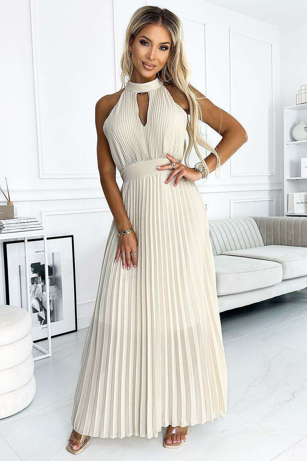 Step into sophistication with the Chic Beige Pleated Chiffon Midi Dress, an exquisite piece that beautifully merges elegance with modern design. This stunning dress features a captivating back teardrop cutout that is sure to turn heads and elevate your style.