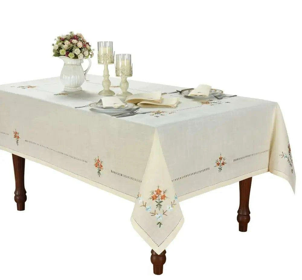 Elevate your dining experience with the Elegant Beige Handcrafted Table Linens Set, designed for those who appreciate the finer things in life. This exquisite ensemble includes a beautifully hemstitched and embroidered tablecloth and 8 matching napkins, crafted with meticulous care by skilled artisans.
