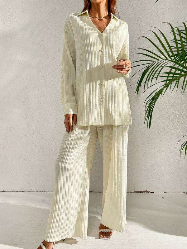 Chic Pleated Blouse and Flowy Wide-Leg Trousers Set for Modern Women