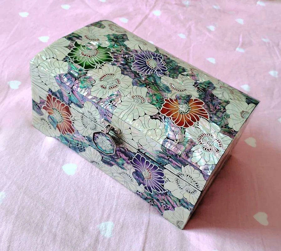 • Artisan Craftsmanship: Each jewelry box is meticulously handmade, showcasing intricate designs featuring mother of pearl butterflies and peonies, symbols of prosperity, good luck, and romantic love.