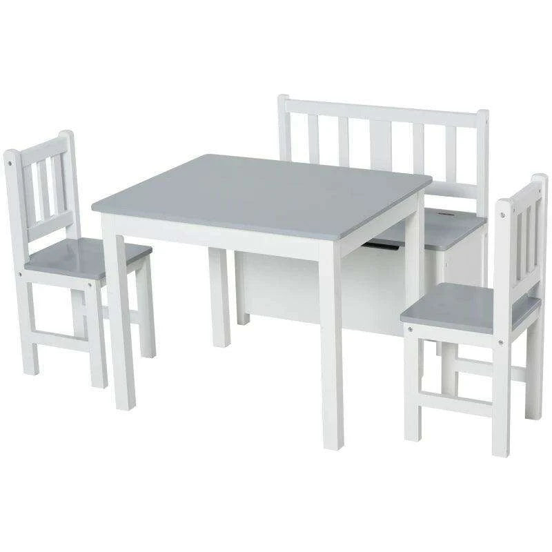 Stylish Grey and White Children's Table Set with Storage Bench and Two Chairs - Ideal for Imaginative Play and Learning Activities..