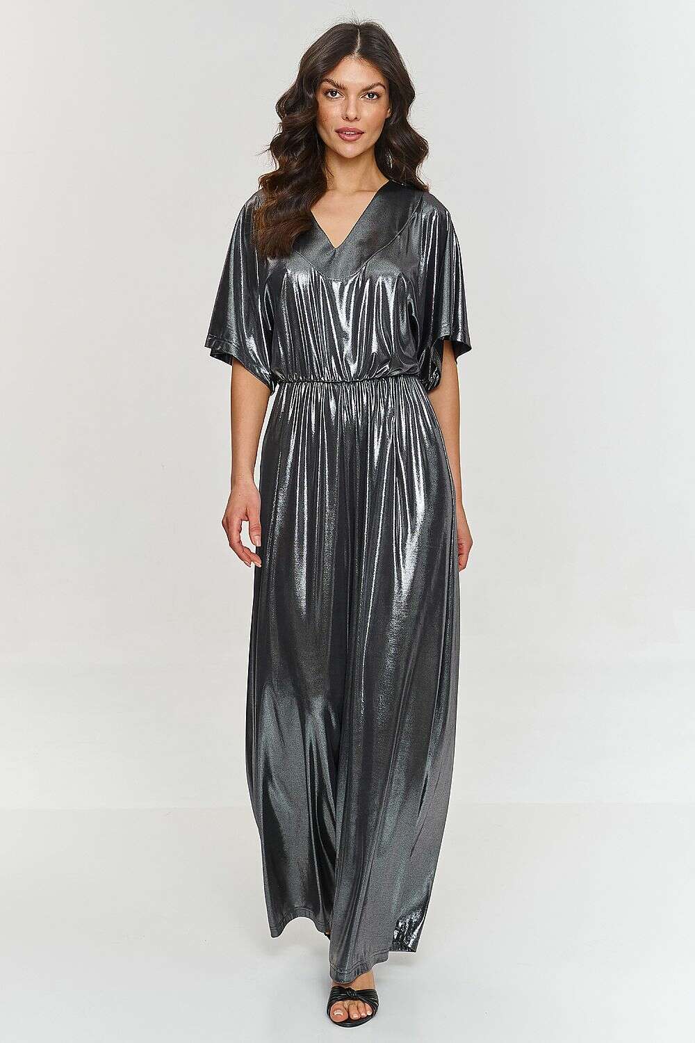 This jumpsuit is a combination of elegance and comfort, which will definitely attract attention at any special occasion. The loose top with kimono-style sleeves adds lightness and freedom to it. This detail makes the outfit look exceptionally stylish, while not restricting movement. The V-neck is subtle and elegant, perfectly highlighting the neck and shoulders. This neckline adds sensuality and emphasizes the feminine silhouette, maintaining a classic, sophisticated look. The wide-legged trousers give the jumpsuit lightness while masking figure imperfections and allowing to elongate the silhouette. The elastic waistband guarantees a perfect fit and emphasizes the figure, creating a waist-cinching effect. Thanks to this, the jumpsuit not only looks stylish, but also feels comfortable throughout the day or evening. The model is made of delicate material with a metallic finish, giving the outfit a unique shine and modern character. A metallic jumpsuit with a V-neck is a proposal that will make you stand out from the crowd. Its modern cut and shiny material will make you feel confident and stylish at any party. It is a perfect alternative to a dress, guaranteeing comfort and a unique look.