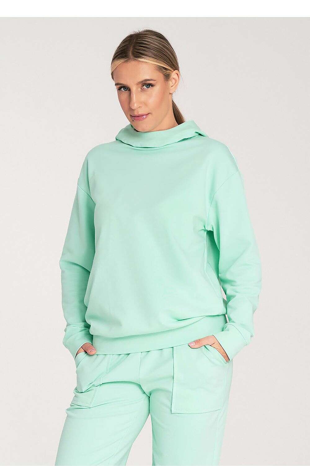 Cotton sweatshirt with long sleeves, loose collar and hood. The bottom of the sweatshirt and the sleeves are finished with ribbed cuffs.