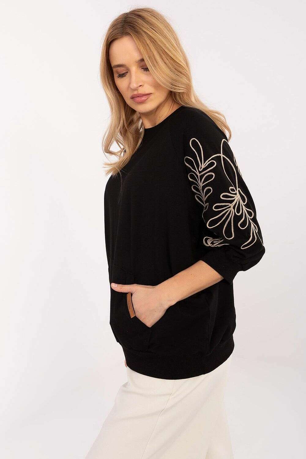 Women's casual blouse put on over the head, perfect for everyday wear and work. Made of soft cotton with a touch of elastane, it ensures comfort and freedom of movement. A model of standard length with 3/4 sleeves is a perfect choice for every season. A practical kangaroo pocket with a decorative patch adds a sporty character to the blouse. An additional advantage are the embroidered patterns of branches with leaves on the sleeves, which give the whole a subtle elegance. It goes well with both jeans and fabric pants, creating a stylish, comfortable outfit.