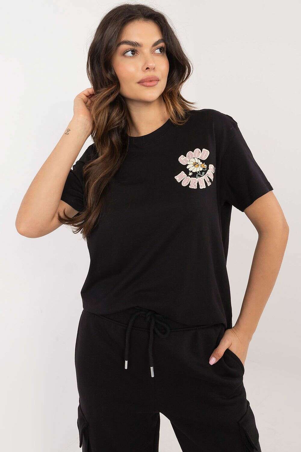 Women's t-shirt with a classic cut, made of high-quality cotton, ensuring comfort when wearing. The front is adorned with a subtle print with a caption, giving the shirt a fashionable, minimalist character. The back features a decorative print combined with dynamic captions, adding original expression to the whole. A model of standard length, with short sleeves and a round neckline, will be perfect for everyday stylizations. An ideal choice for women who appreciate comfort and style in one.