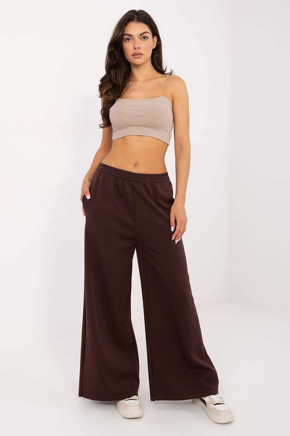 Women's casual sweatpants, perfect for everyday wear and relaxing at home. Made of soft, buttery smooth material, a blend of viscose and polyester. The palazzo style features a high waist, wide legs, and an elastic waistband for comfort and freedom of movement, with side pockets for added functionality. The smooth texture of the material makes it easy to pair these pants with other casual wardrobe pieces.