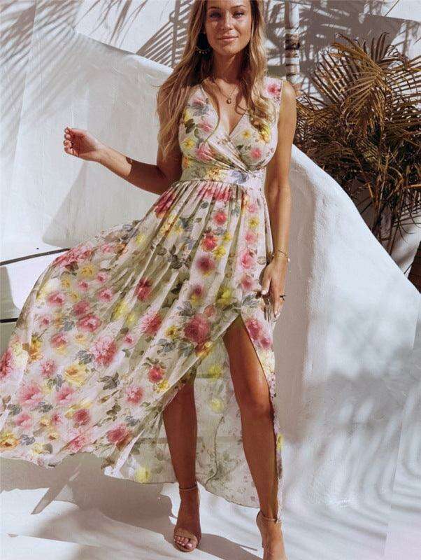 • Design: Adorned with a stunning floral print and chic sleeveless style, it showcases a stylish slit detail that flatters your silhouette and enhances your natural beauty.