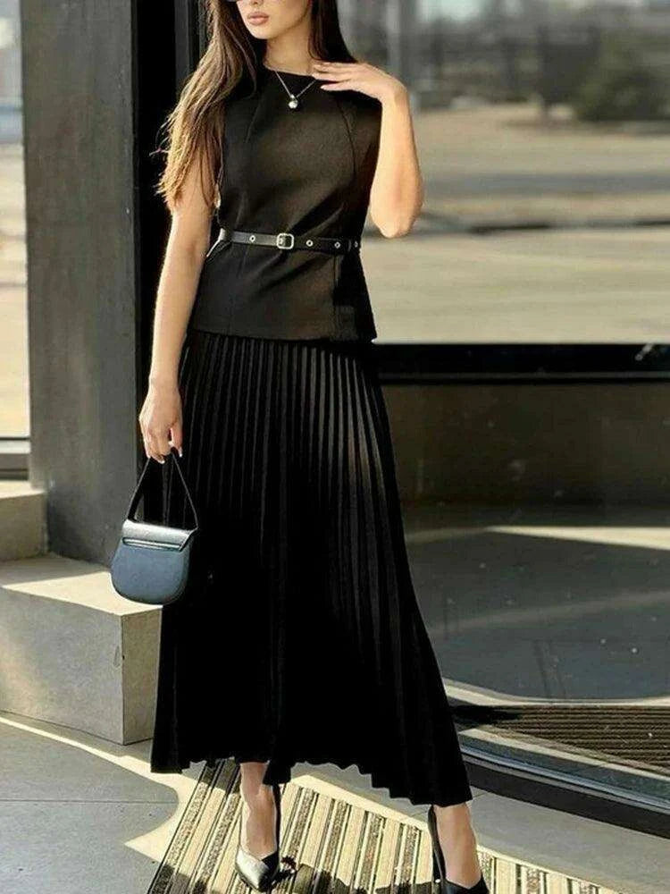• Chic and Timeless Design: The O-neck waistcoat pairs beautifully with the flowing pleated maxi skirt, flattering every silhouette and providing a sophisticated look.
