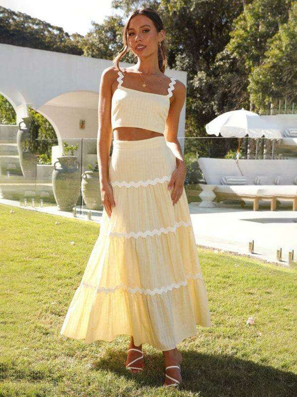 Elevate your spring and summer wardrobe with our Vibrantly Spliced Suspender Top and Flowing Skirt Set—a striking ensemble designed to capture the essence of fun and fashion. This coordinated set perfectly balances style and comfort, making it an ideal choice for any occasion.