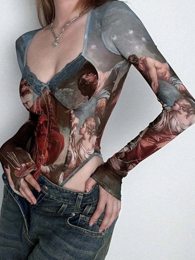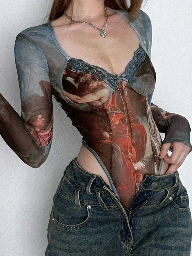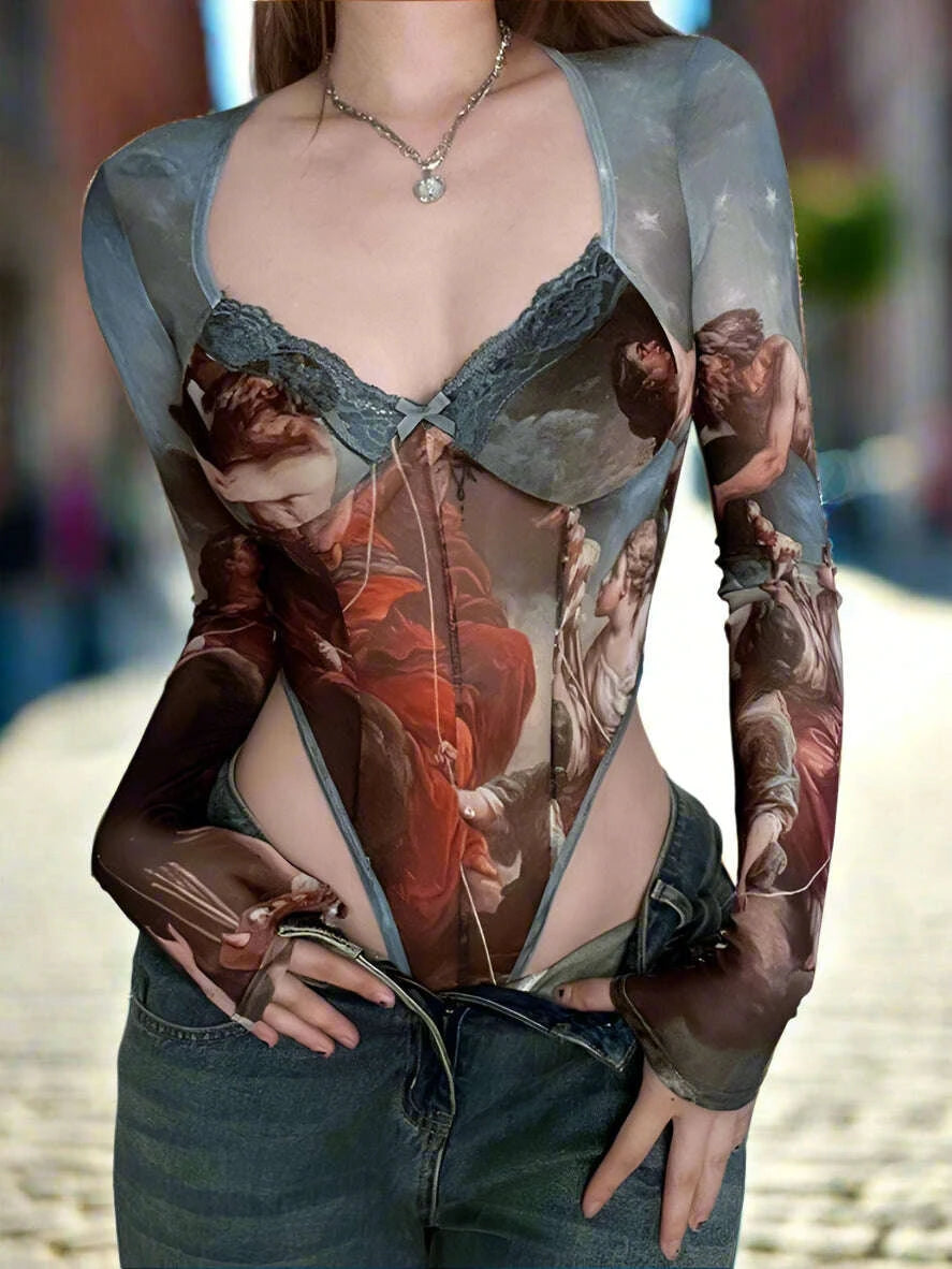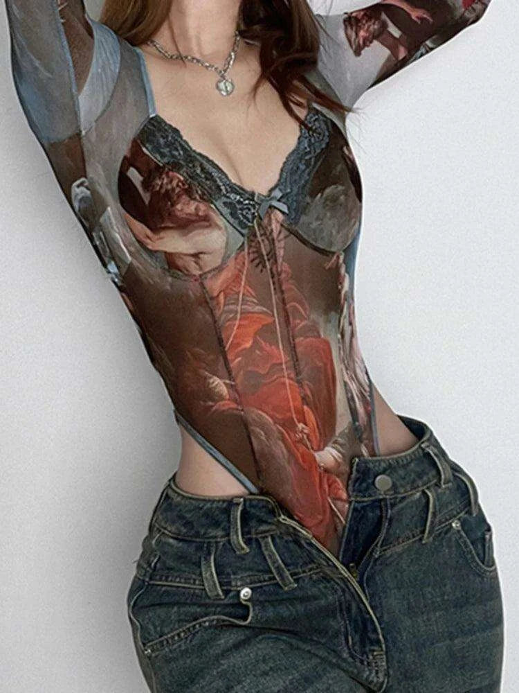 Vintage-Inspired Sheer Long Sleeve Bodysuit with Elegant Square Neckline and Bustier Detailing